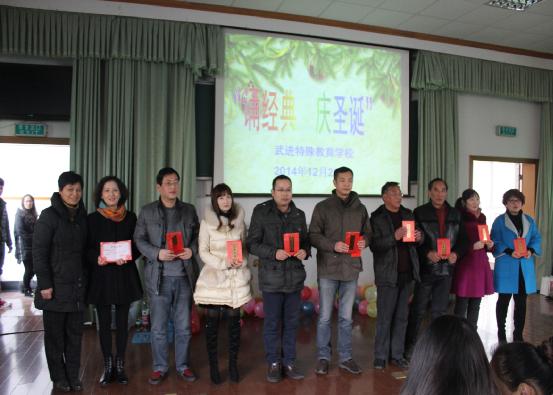 2014年12月25日下午14:00点,武进区特殊教育学校阶梯教室内,来自常州大学等各大院校的志愿者以及师生和学生家长把阶梯教室挤得满满的,在圣诞节这个日子里,学校举行“诵经典·庆圣诞”联谊活动,协会也应邀出席共同参与。借助学校这个平台,协会此次再次来到学校,将为在创投公益活动中被评选出的10名“2014年度优秀家长”颁发奖金,鼓励家长在长期的帮扶自己残障孩子成长过程中付出的爱心,表彰他们坚持不懈的付出。虽然每个家长500元的奖励不算很多,但是协会的一份心意已经浓浓地跃然而出。联谊会上,家长感谢协会对残障孩子的关心和帮助,表示将一如既往的对自己残障孩子承担作为家长的责任。协会此次对10名优秀家长的表彰,彰显出协会的仁爱和勇于承担社会责任和社会义务。协会将继续发扬这种精神,弘扬社会真善美。